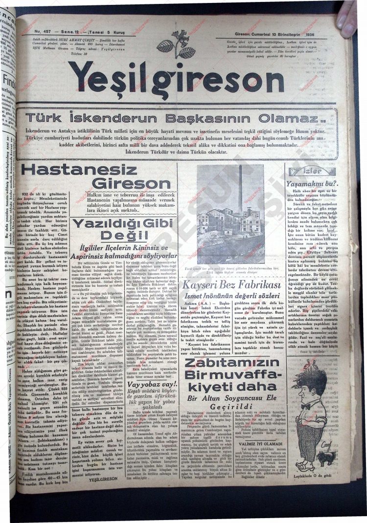 10 Ekim 1936 Tarihli Yeşilgiresun Gazetesi