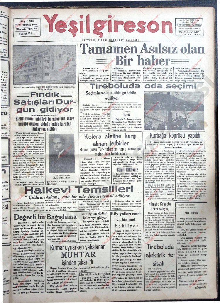 18 Ekim 1947 Tarihli Yeşilgiresun Gazetesi