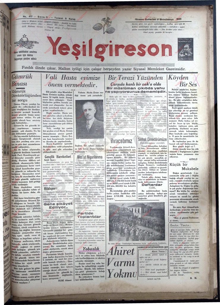 21 Aralık 1935 Tarihli Yeşilgiresun Gazetesi