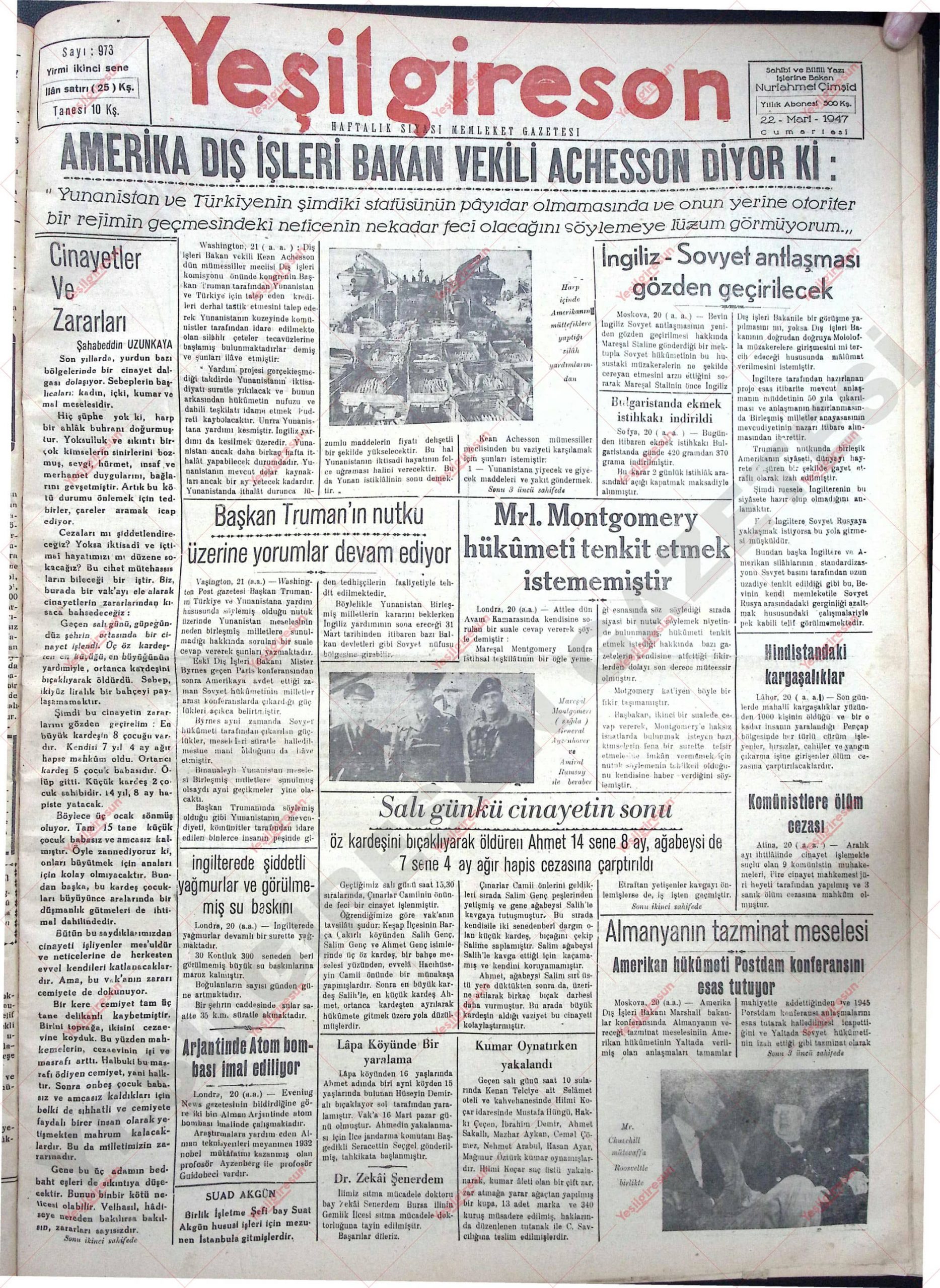 22 Mart 1947 Tarihli Yeşilgiresun Gazetesi