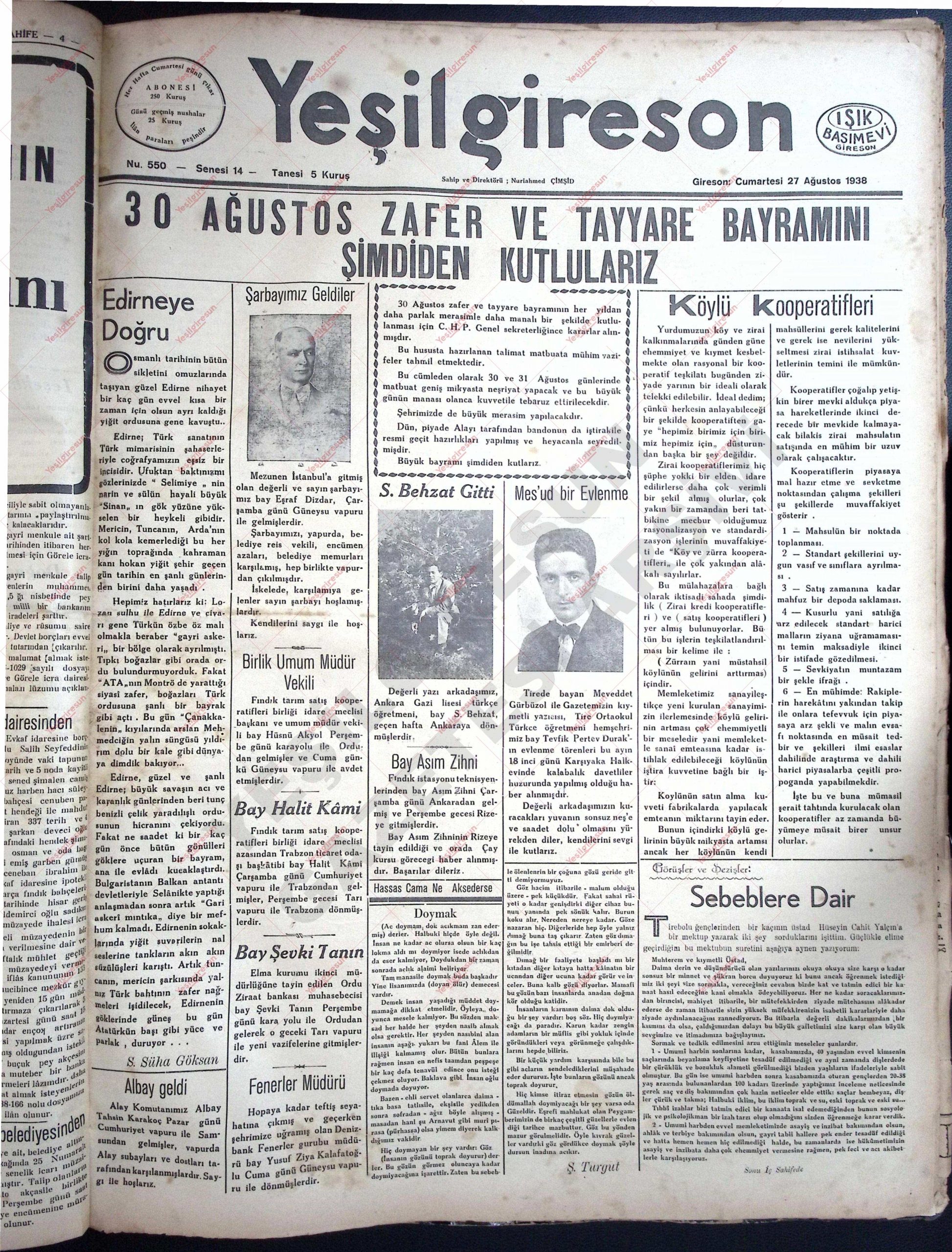 27 Ağustos 1938 Tarihli Yeşilgiresun Gazetesi