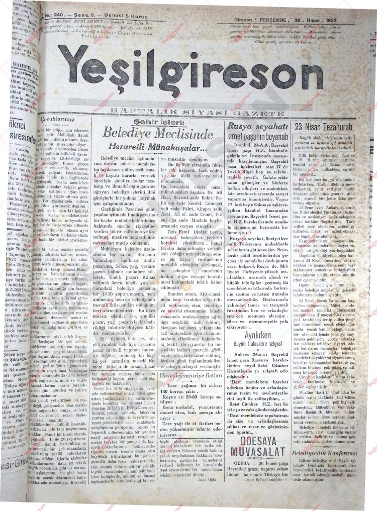 28 Nisan 1932 Tarihli Yeşilgiresun Gazetesi