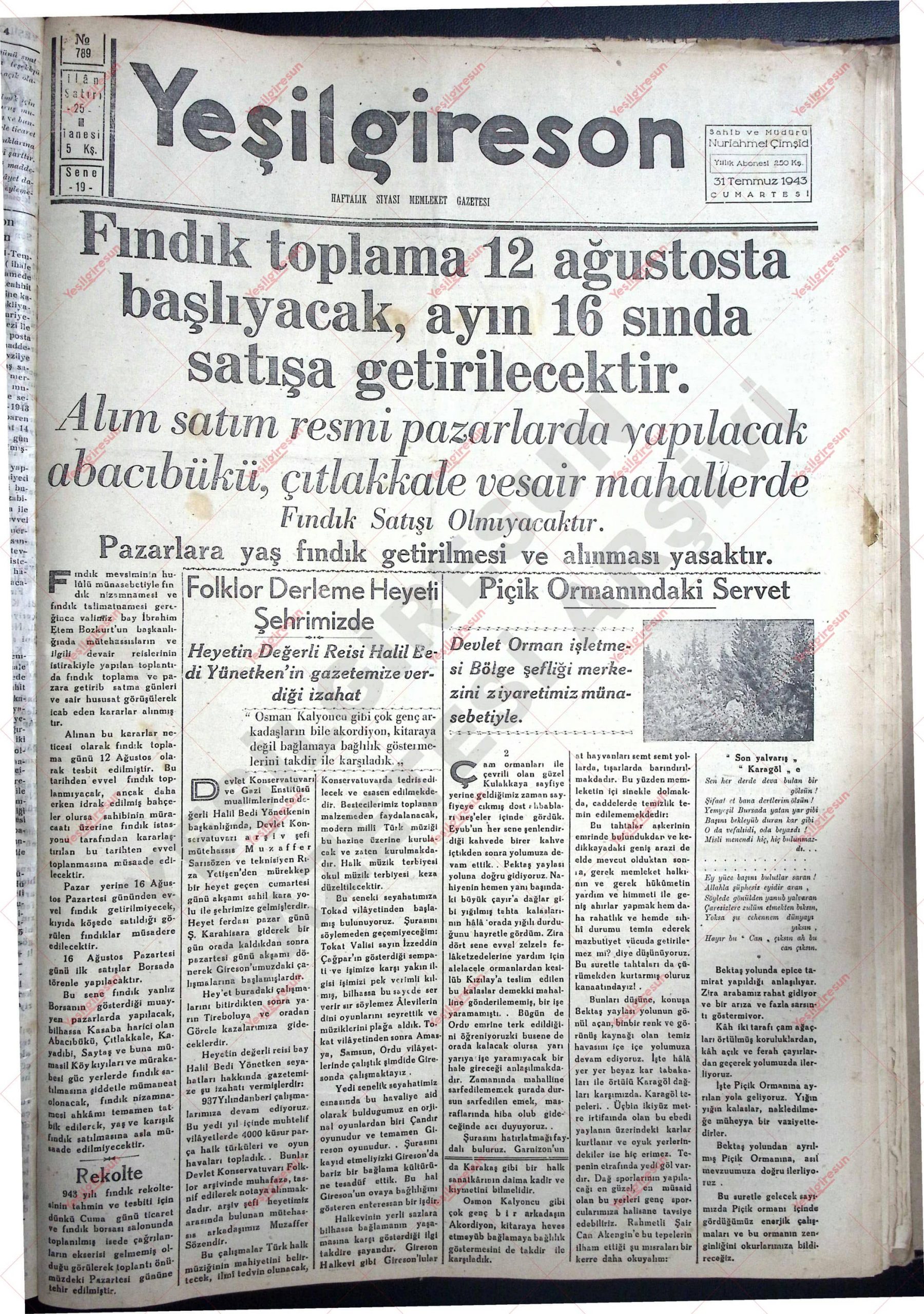 31 Temmuz 1943 Tarihli Yeşilgiresun Gazetesi