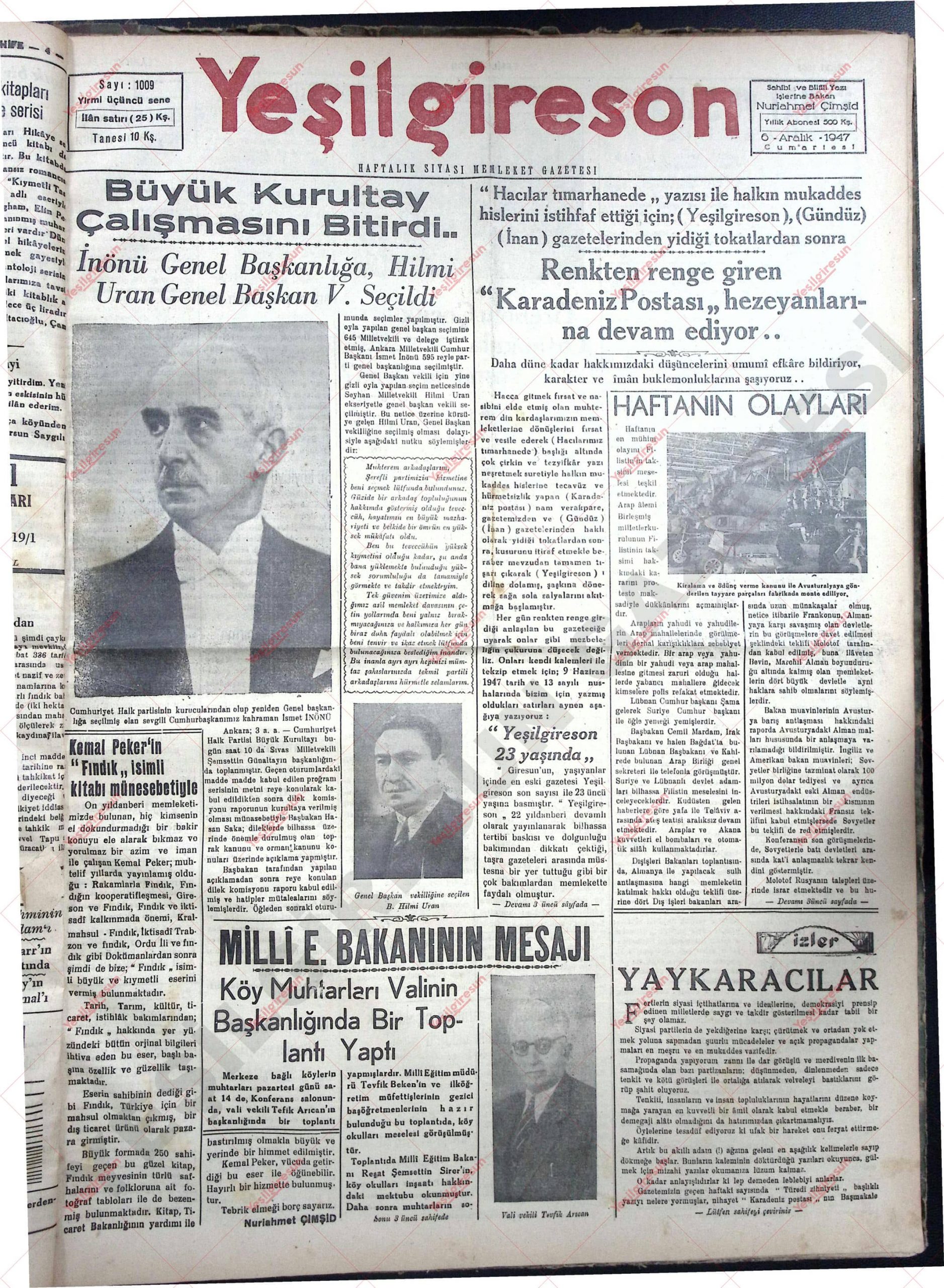 6 Aralık 1947 Tarihli Yeşilgiresun Gazetesi